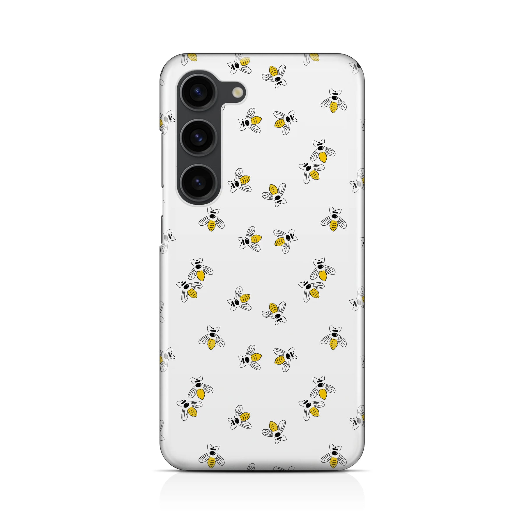 The phone case is adorned with a charming pattern of bees scattered across. The bees are illustrated in a cute, cartoon-like style with prominent stripes and delicate wings, giving the case a playful and cheerful appearance. This design would be well-suited for someone who enjoys nature-inspired accessories with a light-hearted and whimsical touch.